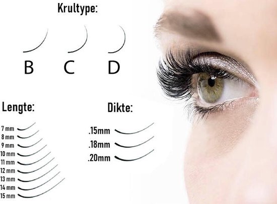 Ik werk met de B, C en D- krul. De B-krul is iets rechter dan dan c, deze gebruik ik voor klanten die van natura ook hele rechte of kort wimpers hebben. Hierbij zie je niet dat je extensions op hebt en is de look minimaal. De C-krul is een natuurlijke krul, net iets meer dan je eigen wimpers. Deze zou ik aanraden als je een natuurlijke set wilt of iets langere wimpers wilt hebben dan jezelf hebt.